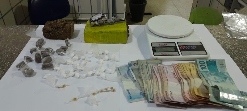 Durante a revista pessoal ao suspeito, foi encontrado também um molho de chaves de residência em um dos seus bolsos, que, ao ser questionado de qual imóvel seria, ele negou também saber de onde seria. Os Policiais saíram tentando localizar a residência dele, perguntando para moradores da referida localidade, que apontaram que seria na Rua Caminho 08, que, ao se deslocar, encontraram a residência, que estava fechada, mas que as chaves abriram a porta do imóvel, onde foi encontrada outra quantidade de drogas, que somadas foram apreendidas na seguinte quantidade de entorpecentes: 15 buchas e dois tabletes pequenos (504 gramas); 29 papelotes de cocaína (16 gramas); 08 pedras de crack (1 grama); 01 balança de precisão e o valor em espécie de R$ 640,00.