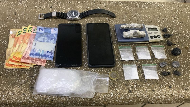Os PMs tiveram que usar da força para poder contê-los, tendo que algemá-los, e ao fazerem abordagem ao suspeito, que foi identificado como “Carlos Berg de Oliveira Brito”, vulgo “Berg”, 38 anos, e (F.B.V.), 41 anos. Com eles foram encontrados: 13 papelotes de cocaína; 02 porções de maconha (22 gramas); 01 balança de precisão; 02 aparelhos celulares, o valor em espécie de R$ 123,00, além de materiais para embalagem dos referidos entorpecentes. Momento em que receberam voz de prisão, sendo conduzidos para delegacia territorial, onde foram apresentados para a equipe do delegado plantonista, Dr. Gean Nascimento, que, após a realização dos procedimentos legais, flagranteou o apresentado “Carlos Berg” por tráfico de drogas e resistência, pois ele assumiu que a droga seria dele, e que a sua companheira não sabia da sua atividade ilícita, determinando o recolhimento dele para a carceragem daquela unidade policial, onde seguem presos à disposição da Justiça.
