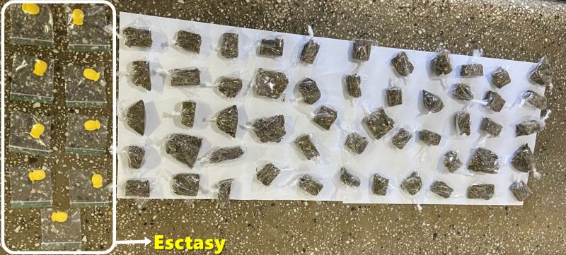 Os Militares avançaram de forma rápida com a viatura, mas, ao chegarem no cruzamento, não foi mais visto o suspeito, que tomou destino ignorado. Os Policiais, ao retornarem no local onde ele teria jogado a referida sacola, recuperaram-na, que estava contendo a seguinte quantidade de entorpecentes: 52 porções de maconha (176 gramas), e 09 comprimidos de substância sintética (ecstasy). O que tem se observado é que tal droga tem se tornado comum nas apreensões na cidade, o que significa que a referida droga tem aumentado o seu consumo por parte de usuários, o que está elevando a comercialização da referida droga na cidade de Teixeira de Freitas, que é química pura, com produtos de naturezas e potencial que deixam as pessoas totalmente dependentes, como o crack, porém ela é mais cara e com efeito mais prolongado, e, por esse motivo, ela pode estar se tornando um grande problema para a nossa sociedade, com aumento de crimes tipo roubos/furtos e homicídios.