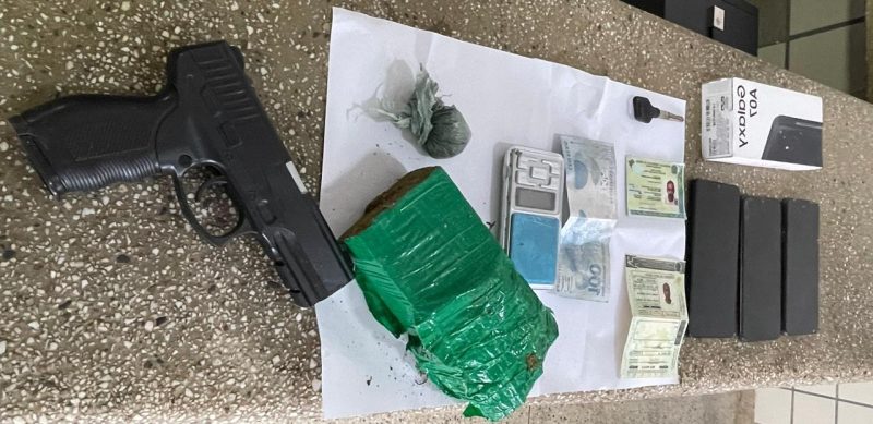 Os Militares então realizaram intervenção de forma rápida e tática ao suspeito, que não teve como realizar nenhum tipo de reação, recebendo voz de abordagem. Ele se identificou como sendo a pessoa de “Udemarques dos Santos Ferreira”, 36 anos, que estava com um simulacro de arma de fogo tipo pistola na cintura, apresentado como documento de identificação uma Carteira de Habilitação – CNH, que ao ser consultada no Sistema Integrado das Forças Policiais, foi possível identificar que a mesma seria falsa, além de uma cédula no valor de R$ 100,00 também falsa. Os policiais lhe indagaram sobre a comercialização de drogas e se haveria drogas dentro do imóvel. Ele então confirmou que sim, mas que seria para o seu uso, quando foi apontado pelo mesmo onde estaria um tablete e uma porção de maconha (365 gramas), além de uma balança portátil.