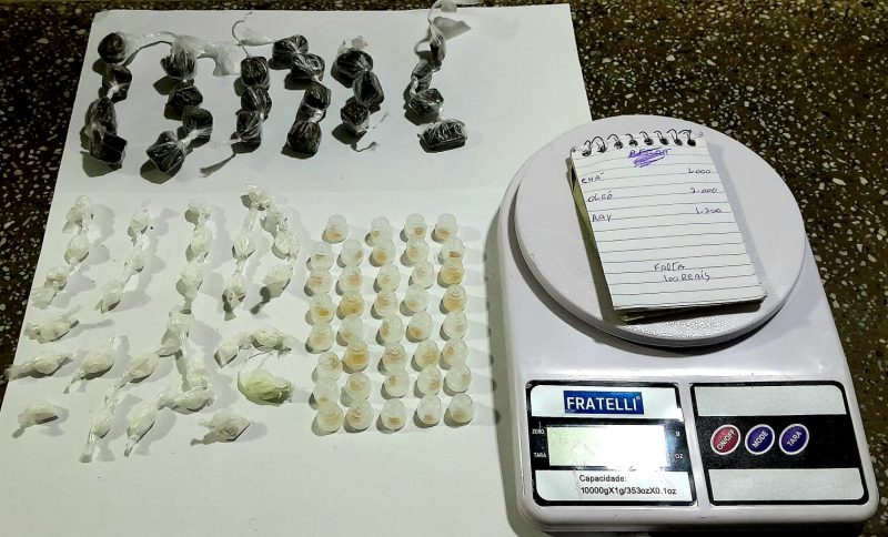 Policiais do PETO da 88ª CIPM estavam em patrulhamento ostensivo tático no distrito de Guarani, município do Prado (BA) na noite desta segunda-feira, 22 de setembro, quando ao passarem pela Rua Mário Ferreira, visualizaram um suspeito com uma mochila, que ao perceber a presença da viatura, ele passou a andar mais rápido e olhando para traz diversas vezes, o que chamou atenção dos PMs, que avançaram, interceptando o suspeito, que recebeu voz de abordagem, sendo identificado como “Diogo das Virgens Nascimento”, 29 anos, que ao fazer conferência no interior da mochila, foi encontrado a seguinte quantidade de entorpecentes, 39 pedras de crack; 29 papelotes de cocaína; 22 buchas de maconha, além de uma balança de precisão e uma caderneta de anotações de carga e comercialização das referidas drogas.