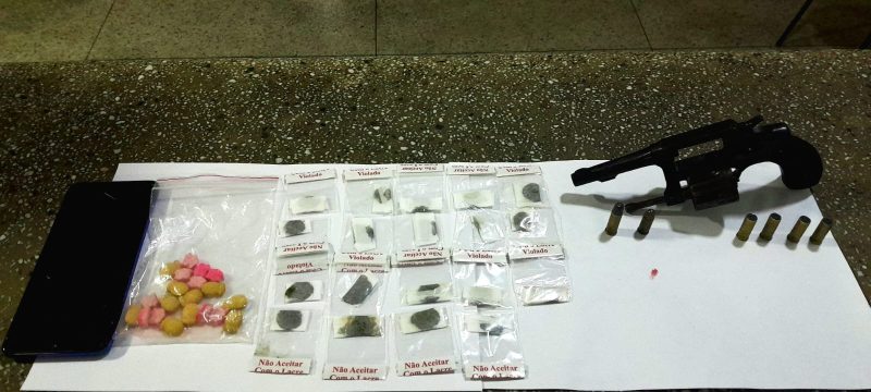 Já na noite desta mesma data, a mesma guarnição estava em patrulhamento pela área Central do distrito, quando avistaram novamente o adolescente, que demonstrou estar assustado após visualizar a viatura, o que foi percebido pelos PMs, que ao se aproximarem, lhe deram voz de abordagem, quando foram encontrados 19 papelotes de haxixe e 20 comprimidos de ecstasy em suas vestes. Os militares então lhe indagaram sobre o restante da droga e uma arma que ele estaria ostentando em outra ocasião, e que eles teriam obtido a informação deste fato após a sua primeira prisão nesta data. O adolescente então informou que a arma estaria em sua residência, sendo realizada diligência continuada até o imóvel, onde foi localizado um revólver de marca Smith Wesson, calibre .32, municiado com 06 munições intactas.