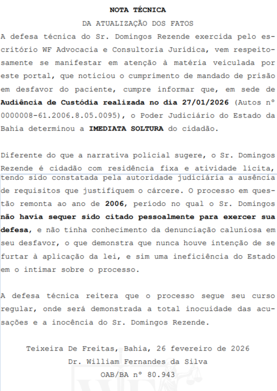 Guarnição do PETO da 89ª CIPM estavam em patrulhamento no início da noite desta terça-feira, 20 de janeiro, no distrito de Belo Cruzeiro, município de Mucuri (BA), quando ao passarem pela Rua Alex Cirino, perceberam que uma pessoa do sexo masculino, teria entrado de forma rápida para o interior de um estabelecimento, o que chamou atenção dos PMs, que avançaram rapidamente e desembarcaram dando voz de abordagem para o suspeito, que foi identificado como “Domingos Rezende Da Silva”, vulgo “Bidu”, 44 anos, que ao realizarem consulta no Sistema Integrado das Forças Policiais, foi encontrado um mandado de prisão preventiva em seu desfavor, expedido pela Vara Plena da Comarca do município de Ibirapuã (BA), onde ele é investigado por suposto estupro, expedido na data de 01/12/2025, pelo Magistrado, Dr. Johnaton Martins.