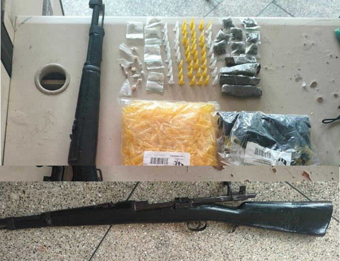 Os Militares ao fazerem uma busca no local, encontraram um fuzil marca Herstal, calibre 7,62; 53 pinos e 06 papelotes de cocaína; 12 porções de maconha; 10 pedras de crack e materiais para embalagem dos entorpecentes. Todo o material apreendido foi apresentado na delegacia territorial daquela cidade.