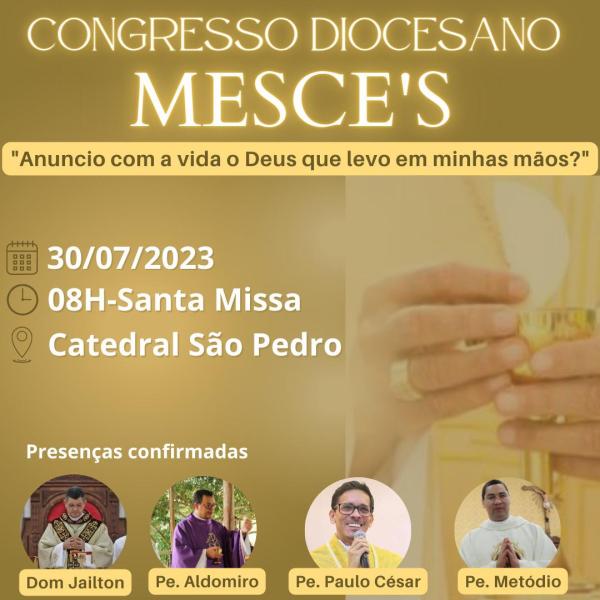 A Coordenação Diocesana dos MESCES juntamente com o Padre Aldomiro Aciole, assessor desse Ministério, convida os Ministros Extraordinários da Sagrada Comunhão Eucarística para participar do “Congresso Diocesano do Ministros Extraordinários da Sagrada Comunhão Eucarística (MESCE)”, que acontecerá no próximo de 30 de julho de 2023, na Catedral São Pedro, na cidade de Teixeira de Freitas, com início às 8h com a Santa Missa, e encerramento às 16h.