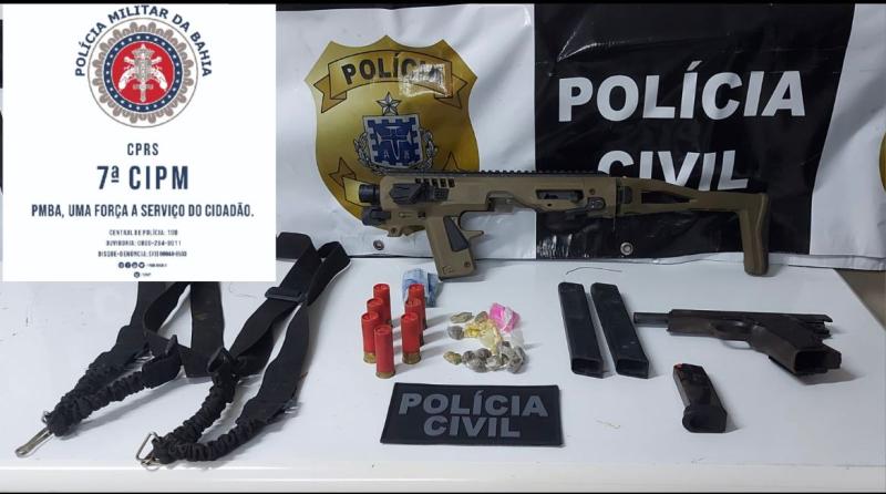 Na ação foram apreendidas as seguintes armas e munições, que estavam dentro de um túnel enterrado na mesma área de mata: 01 Pistola calibre .9mm; 03 Carregadores; 01 Conversor para Pistola; 07 Munições calibre .12; 02 Munições calibre .40; 01 Munição calibre .9 mm. Na ação das Forças Policiais foram apreendidos ainda, 28 gramas de crack; 18 gramas de Cocaína; 07 gramas de Maconha; 01 balança de precisão; e cinco aparelhos celulares.