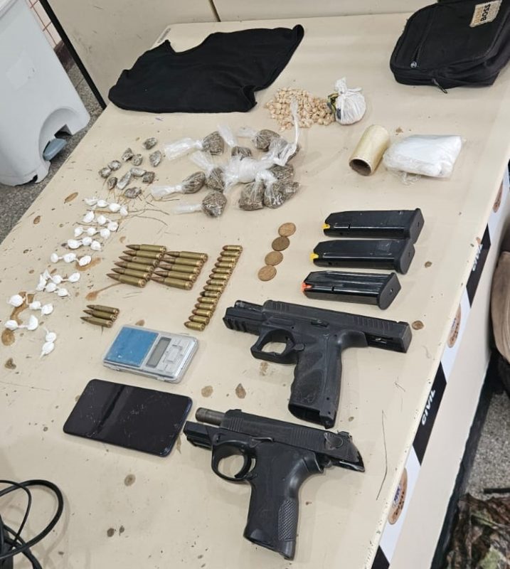 Os Militares apreenderam os seguintes materiais, além das referidas armas (pistolas): 03 carregadores para cartuchos .9mm e 14 munições do mesmo calibre; 11 munições intactas de calibre .7,62; 03 munições de calibre .5,56; 29 papelotes de cocaína; 11 buchas de maconha; 11 porções de Skank; 96 pedras pequenas e uma maior de crack; 01 balança de precisão; 01 balaclava (toca ninja); 01 aparelho celular; 01 mochila e roupas camufladas. Todo o material apreendido foi apresentado na delegacia territorial do referido município de Santa Cruz Cabrália, onde foi registrado o Auto de Resistência com resultado em morte decorrente de injusta agressão sofrida contra a vida dos policiais militares e contra o Estado de Direito, por eles representado na ação policial, que após a realização dos procedimentos legais, a autoridade policial, solicitou ao Departamento de Polícia Técnica (DPT) a remoção dos corpos para o IML/Porto Seguro, para realização de exame de necropsia e identificação, no qual um dos suspeitos teria sido identificado como sendo “Guilherme dos Santos Baião”, 22 anos, e o segundo até o fechamento desta matéria, não haveria sido identificado ainda.