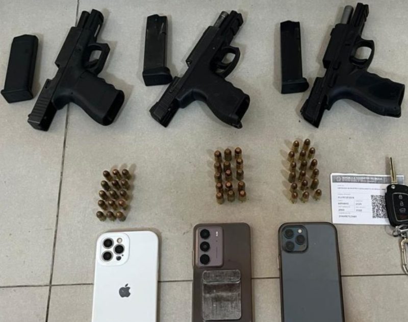 Momento em que houve êxito por parte das guarnições, que interceptaram o referido veículo já próximo ao Posto da Polícia Rodoviária Federal – PRF, sendo realizado um cerco tático no entorno do veículo, não dando chances para os suspeitos reagirem, os quais foram abordados, sendo identificados como sendo um adolescente de 16 anos, que estava na companhia dos comparsas “Guilherme Araújo Ramos”, 18 anos, e “Josemar dos Santos Macedo”, 26 anos, que estavam portando as seguintes armas de fogo: 01 Pistola marca Taurus/TH9, calibre . 9mm municiada com 17 cartuchos intactos; 01 Pistola marca Taurus/PT 24/7, de calibre .40, municiada com 15 cartuchos intactos; 01 Pistola marca Glock/G25, de calibre .380, municiada com 15 cartuchos. Além de três aparelhos celulares.