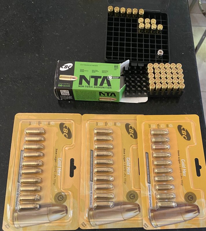 01 – Caixa de munições com 4 munições CBC luger 9mm/ 9 munições CBC TREINA / 01 munição 9mm;