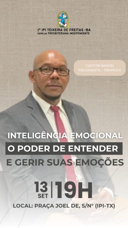 Teixeira de Freitas, 13 de setembro de 2025, próximo sábado, às 19h, a Igreja Presbiteriana Independente – IPI de Teixeira de Freitas recebe um evento imperdível para quem busca autoconhecimento e desempenho emocional. A palestra presencial “Inteligência Emocional: O Poder de Entender e Gerir as Emoções”, comandada por “Cleoton Manoel”, promete oferecer ferramentas práticas para gerir emoções de forma eficaz e impulsionar tanto a vida pessoal quanto a profissional.