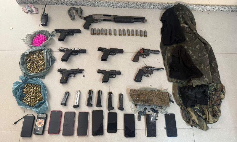 As demais equipes que ficaram no local realizaram a prestação de socorro aos resistentes localizados, sendo 8 criminosos, além de apreensão de várias armas de fogo, entre elas uma espingarda (escopeta) de calibre .12; pistolas de calibres .9mm, .40, .380; e revólveres de calibre .38. Sendo apreendida também uma grande quantidade de munições para os referidos calibres das armas apreendidas, e de calibre para fuzil 5,56, no qual estaria com os criminosos que conseguiram fugir para mata adentro, atirando contra os policiais com fuzis e submetralhadoras, decorrente de rajadas que foram efetuadas contra os policiais.
