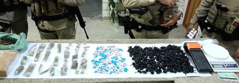 Os Militares ao recuperar a sacola deixada para trás, encontraram a seguinte quantidade de entorpecentes: 224 papelotes de cocaína (200 gramas); 36 porções e três tabletes de maconha (1.442 kg); 200 comprimidos de ecstasy; 01 balança de precisão; 01 máquina de passar cartão, e uma carteira contendo o documento de um dos suspeitos que teria fugido, sendo reconhecido pelos PMs por outras denúncias de traficância. Todo o material apreendido foi apresentado na delegacia territorial para a equipe do delegado plantonista, Dr. Bruno Ferrari, que após a lavratura da ocorrência, tomou as medidas cabíveis.