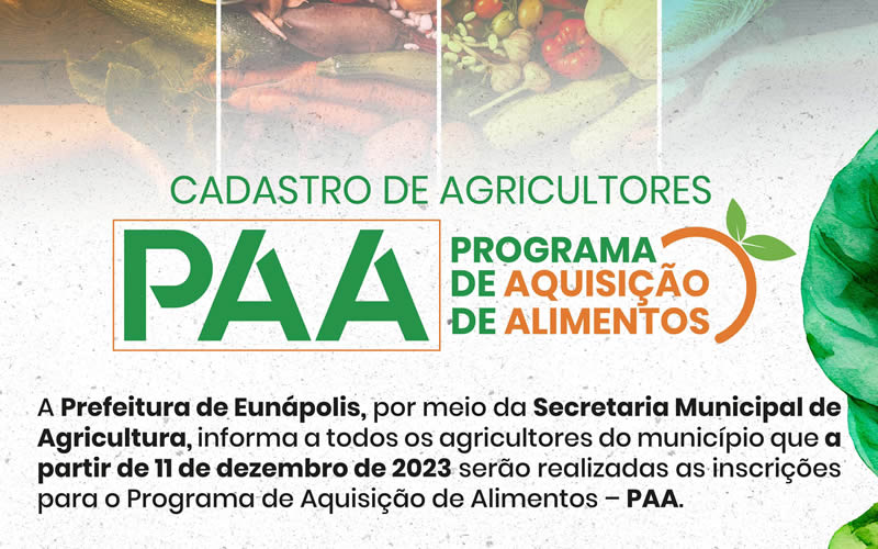 A Prefeitura de Eunápolis, por meio da Secretaria Municipal de Agricultura, informa a todos os agricultores do município que a partir de segunda-feira (11) serão abertas as inscrições para o Programa de Aquisição de Alimentos (PAA). A iniciativa, destinada a fortalecer a agricultura familiar, visa garantir o acesso à alimentação de qualidade às pessoas em situação de vulnerabilidade social