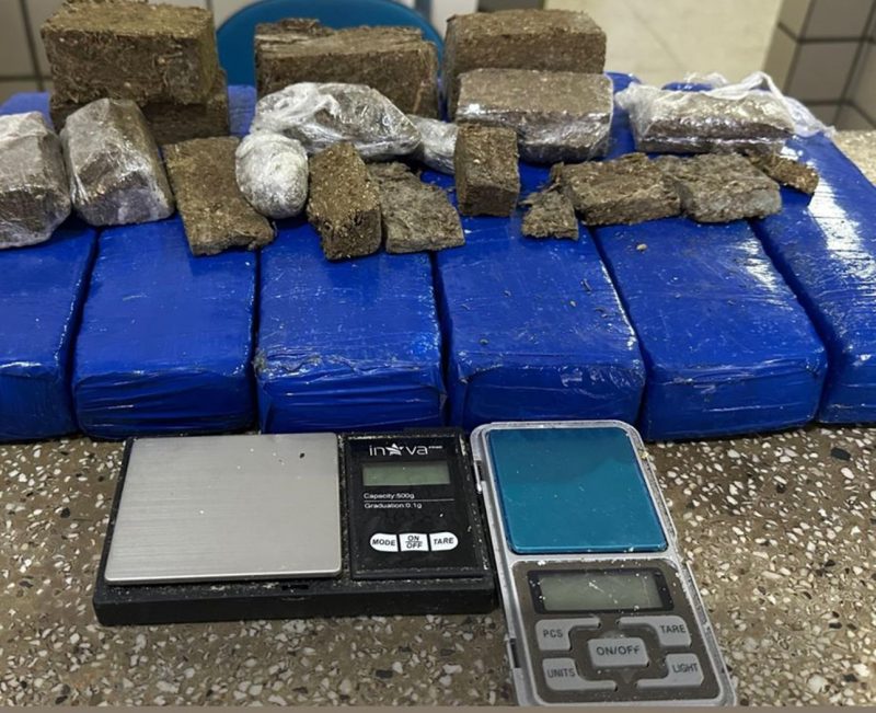 Os Militares apreenderam 3,870 kg de maconha dividida em 06 tabletes grandes e 14 pedaços menores, além de 01 porção de cocaína (175 gramas) e duas balanças de precisão. Todo o material apreendido foi apresentado na delegacia territorial, para a equipe do delegado de plantão, que após a lavratura da ocorrência de apresentação, tomou as devidas providências.
