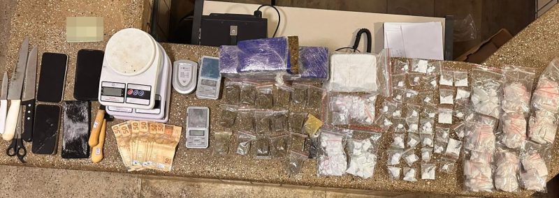 Os PMs, em ato contínuo, ao juntaram os três suspeitos, e questionaram a questão da quantidade das drogas encontradas, e onde estaria o restante da carga, pois as informações eram de que a quantidade de drogas seria maior do que aquela encontrada até então. Foi quando o denunciado (Luiz Eduardo/Taquara) informou que estaria em outra residência próxima daquele local, quando foi realizada a diligência contínua, sendo apontado pelo suspeito onde estaria o restante da carga, que somada foi apreendido 3,235 Kg entre maconha e cocaína, que fracionados em 322 papelotes e uma porção maior de cocaína somados pesaram (935 gramas), já a maconha foram 18 pedaços entre pequenos e maiores que pesaram juntos 2,300 Kg, além de 07 balanças de precisão, 05 facas utilizadas para cortar a droga, 04 aparelhos celulares e o valor em espécie de R$ 300,00. Momento em que receberam voz de prisão, que inicialmente levaram o suspeito “Luiz Henrique/Tamara” para a unidade de Pronto Atendimento – UPA para atendimento médico, decorrente do ombro deslocado, que após a alta médica, foram encaminhados para a delegacia territorial, onde foram apresentados para a equipe do delegado plantonista, Dr. Charlton Bortolini, que após a realização dos procedimentos legais, flagranteou os apresentados acima citados, por tráfico de drogas e associação ao tráfico, determinando o recolhimento de todos para a carceragem daquela unidade policial onde se encontram à disposição da Justiça.