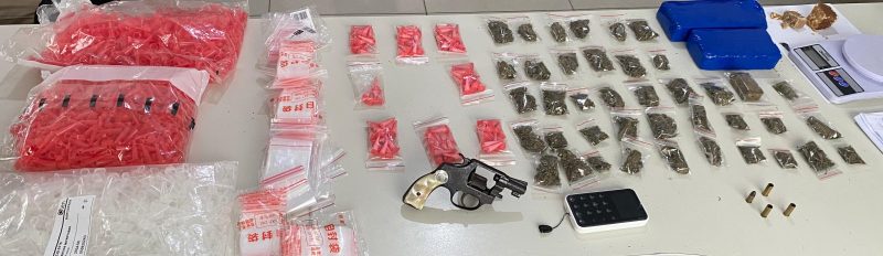 Além da arma apreendida (revólver) com 4 cartuchos deflagrados e um picotado, também foram localizados no imóvel os seguintes materiais: 1,070 Kg de maconha em tabletes; 80 pinos com cocaína (80 gramas); 02 pedras brutas de crack (85 gramas); 01 balança de precisão; 01 celular; 01 máquina de cartão; 01 caderno de anotações da movimentação do tráfico, além de vários materiais para embalagem dos entorpecentes e o valor em espécie de R$ 13,00. Todos os materiais apreendidos foram apresentados na subdelegacia do referido distrito, para a equipe do delegado titular, Dr. Daniel Márcio, que lavrou a ocorrência de apresentação, e realizou os procedimentos legais do Auto de Resistência com resultado em morte, decorrente de resposta a injusta agressão sofrida contra a vida dos policiais militares, e contra o Estado de Direito, representado pelos policiais na ação. A autoridade policial solicitou ao Departamento de Polícia Técnica (DPT) a remoção do corpo para o IML/Teixeira para realização de exame de necropsia, sendo liberado posteriormente para os familiares realizarem os procedimentos fúnebres.