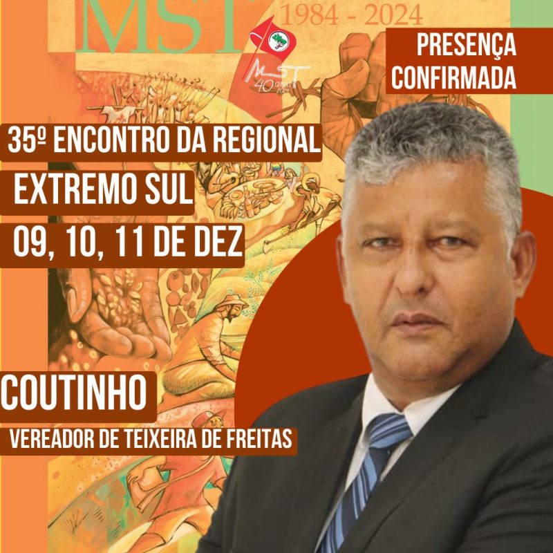 Movimento dos Trabalhadores Rurais Sem Terra (MST) do Extremo Sul da Bahia irá realizar entre os dias 09 a 11 de dezembro na cidade de Teixeira de Freitas o 35º Encontro Regional, que acontecerá na quadra poliesportiva do Colégio Estadual Rui Barbosa, situada na Avenida Presidente Getúlio Vargas, onde irão serem discutidos com as famílias assentadas desta regional, os mais diversos temas voltados para com agricultura familiar, bem como, direitos, benefícios, e a importância do fortalecimento do movimento (MST) para com as garantias destas famílias. Já está confirmada a participação dos representantes da Direção Nacional, a Senhora Eliane Oliveira, representante do MST-BA; o Senhor Evanildo Costa, representante do MST-BA; Lucinha, Secretaria Nacional dos Movimentos Sociais – MST, Além da participação das lideranças do Movimento no Extremo Sul Baiano.