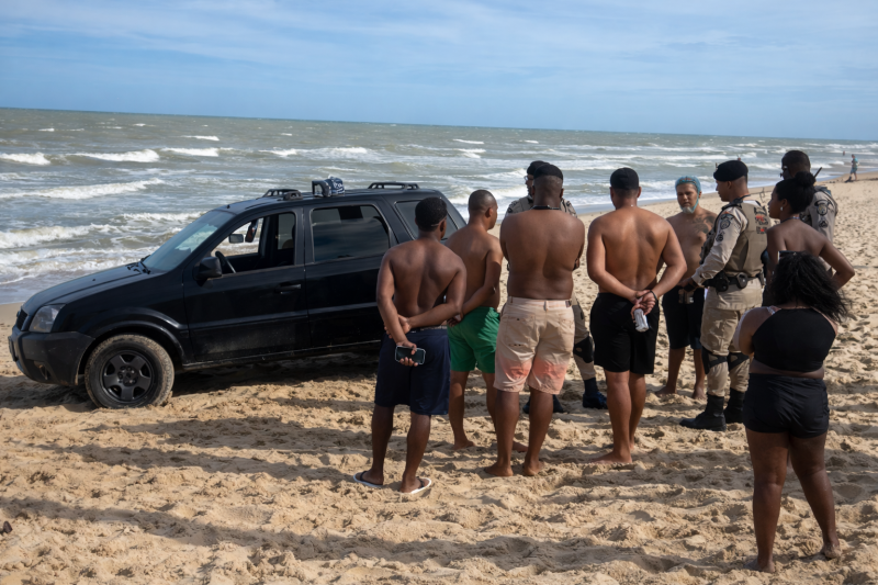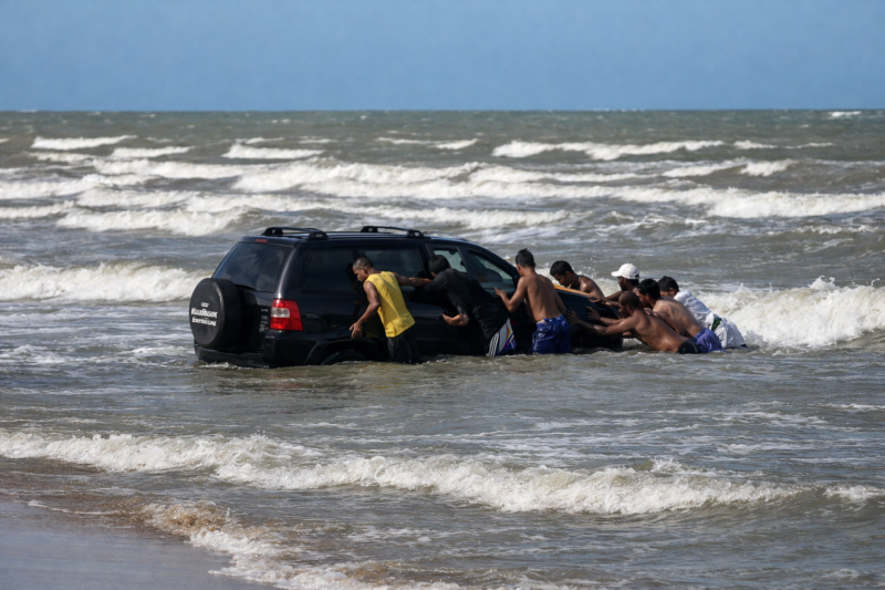 Vídeos: Banhistas impedem que veículo fosse sugado pelas ondas do mar na cidade de Alcobaça; motorista alega que o veículo perdeu os freios